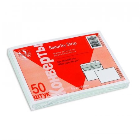 Конверт С5 162х229 мм выполнен из офсета 80 г/м2, имеет клеевое нанесение типа стрип (отрывная силиконовая лента) и специальные насечки-индикаторы на клапане, позволяющие выявить попытку или факт несанкционированного вскрытия.Предназначен для почтовых отправлений различной документации, писем и т.п. Упакован в пленку по 50 штук. Белизна конвертов 146%.Срок годности не ограничен
