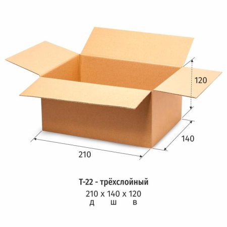 Короб картонный 210×140×120 мм марка Т-22 20 штук в упаковке.Универсальный четырехклапанный короб предназначен для упаковывания, хранения и транспортировки различных грузов с защитой от ударов и влаги. Подходит для упаковки как бытовой химии, так и пищевых продуктов. В пустом виде картонный гофрокороб легко и удобно складывается. Выполнен из трехслойного гофрокартона марки Т-22 бурого цвета. Гофрокартон имеет профиль В.Размеры (ДxШxВ) — 210×140×120 мм (объем 3,53 литра). Для усиления гофрокороба рекомендуется дополнительно укрепить его с помощью упаковочной клейкой ленты. После того как клапаны согнуты, нужно проклеить место стыка лентой внахлест, желательно несколько раз — это позволит повысить прочность конструкции. Дополнительное укрепление коробки выполняется перпендикулярно месту стыковки клапанов на одинаковом расстоянии друг от друга.Продукция промаркирована на одном из клапанов изделия. Маркировка произведена в виде печати с информацией о товаре.