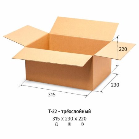 Короб картонный 315×230×220 мм марка Т-22 20 штук в упаковке.Универсальный четырехклапанный короб предназначен для упаковывания, хранения и транспортировки различных грузов с защитой от ударов и влаги. Подходит для упаковки как бытовой химии, так и пищевых продуктов. В пустом виде картонный гофрокороб легко и удобно складывается. Выполнен из трехслойного гофрокартона марки Т-22 бурого цвета. Гофрокартон имеет профиль В.Размеры (ДxШxВ) — 315×230×220 мм (объем 15,94 литра).Для усиления гофрокороба рекомендуется дополнительно укрепить его с помощью упаковочной клейкой ленты. После того как клапаны согнуты, нужно проклеить место стыка лентой внахлест, желательно несколько раз — это позволит повысить прочность конструкции. Дополнительное укрепление коробки выполняется перпендикулярно месту стыковки клапанов на одинаковом расстоянии друг от друга.Продукция промаркирована на одном из клапанов изделия. Маркировка произведена в виде печати с информацией о товаре.