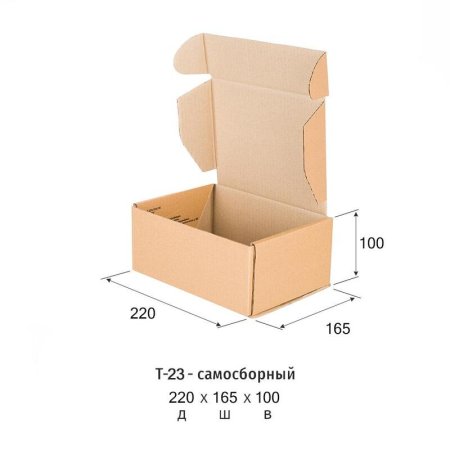 Самосборный короб тип 'Д' длиной 220 мм, шириной 165 мм и высотой 100 мм. Изготовлен из трехслойного гофрокартона. Для изготовления коробки использован картон бурого цвета. Марка картона Т-23 В отличается высоким сопротивлением продавливанию, малым весом. Короб предназначен для бандеролей и посылок, отправляемых почтой (также применяется для интернет-магазинов, курьерской доставки товаров, транспорта и логистики, для хранения и склада). Простая конструкция легко и быстро собирается. Поставляется по 50 штук в упаковке.