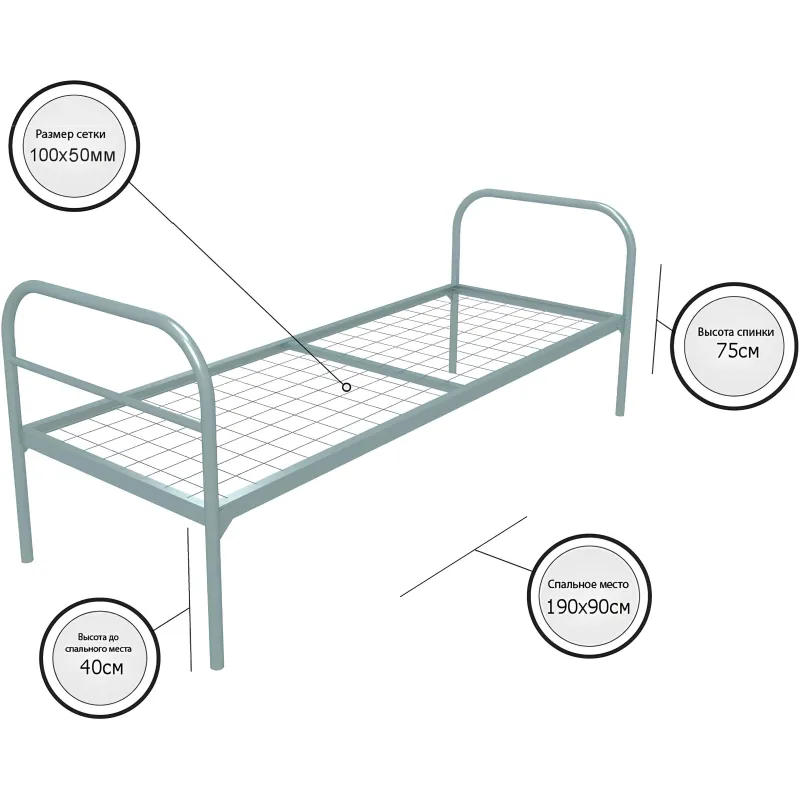 Кровать металлическая одноярусная, идеальна для вахтовых баз, строительных площадок, армейских подразделений, хостелов, бюджетных гостиниц, общежитий и других мест, где важно комфортное и экономичное размещение. Прочная конструкция изготовлена из металла с порошковым покрытием для долговечности. Простота монтажа не требует сложной сборки, состоит из двух спинок и основания.