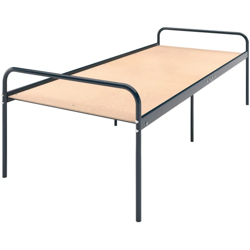 Кровать одноярусная Комус Мебель металлическая для взрослых, для работников на стройках, для общежитий. Нагрузка на кровать составляет 150 кг. Кровать односпальная. Кровать изготавливается из металлической профильной трубы: спинка — из круглой металлической профильной трубы диаметром 25 мм с толщиной стенок не менее 1.5 мм; боковины — из плоскоовальной металлической профильной трубы 60×15 мм с толщиной стенок не менее 1 мм; основание — из квадратной металлической профильной трубы 20×20 мм с толщиной стенок не менее 1.5 мм; средние ножки — из круглой металлической профильной трубы 20 мм с толщиной стенок не менее 1.5 мм. Металлическая труба покрыта порошковой краской, стойкой к химическим и механическим воздействиям. На свободных концах труб установлены заглушки из ударопрочных полимеров, предотвращающие повреждение напольного покрытия. Размер спального места — 800×1900 мм. Настил кровати выполнен из МДФ толщиной 6 мм. Кровать разборная. Для сборки используются DIN болт, гайка М6, болт М8, саморезы с пресс шайбой.