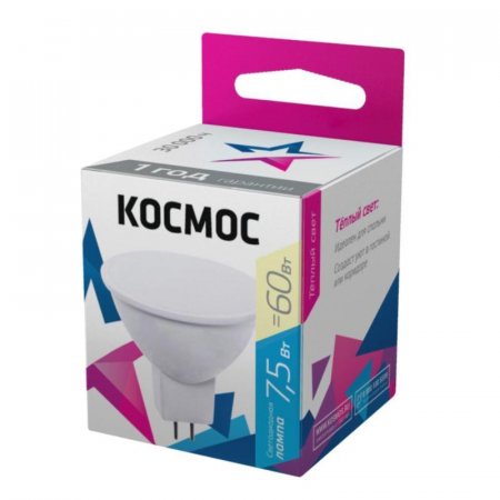 Лампа светодиодная Космос применяется для общего освещения. Имеет длительный срок службы 30000 ч. Мощность лампы 7.5 В.