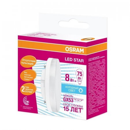 Лампа светодиодная Osram LSGX5375 8W/840 230V GX53 10X1 RU Osram, 800 лм, 8 Вт, 4000 К (нейтральный белый свет). Цоколь GX53, колба GX. Исполнение колбы матовое, пластик. Напряжение питания 230 В.