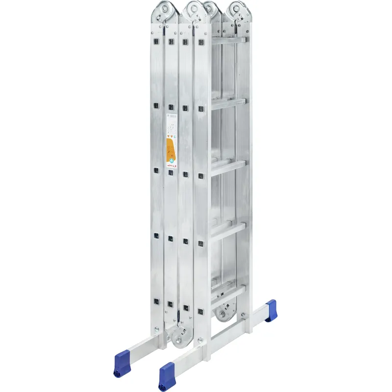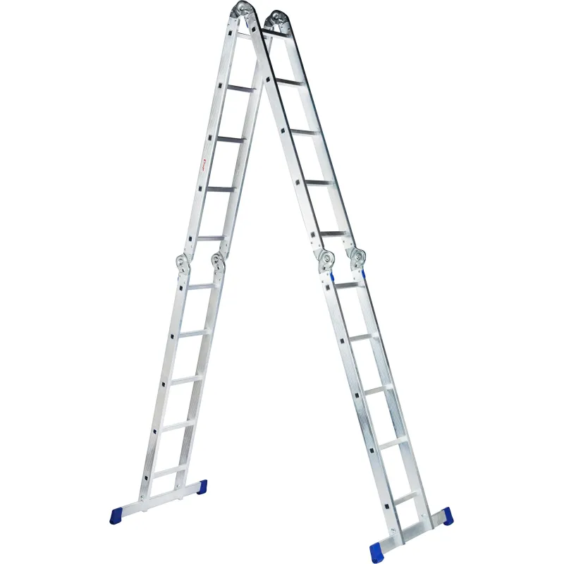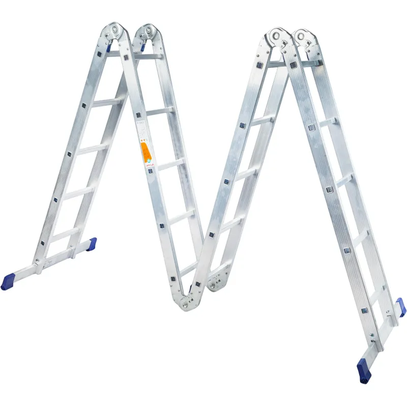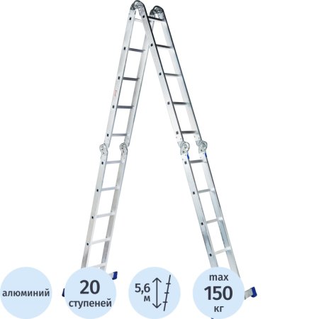 Шарнирная алюминиевая лестница Комус. Представляет собой 4 секции по 5 ступеней, которые можно настроить в 4х рабочих положениях. Можно использовать в качестве приставной лестницы, двухсторонней стремянки и помоста. Пригодится в быту — дом, сад, гараж, а также в коммунальной и строительной деятельности.