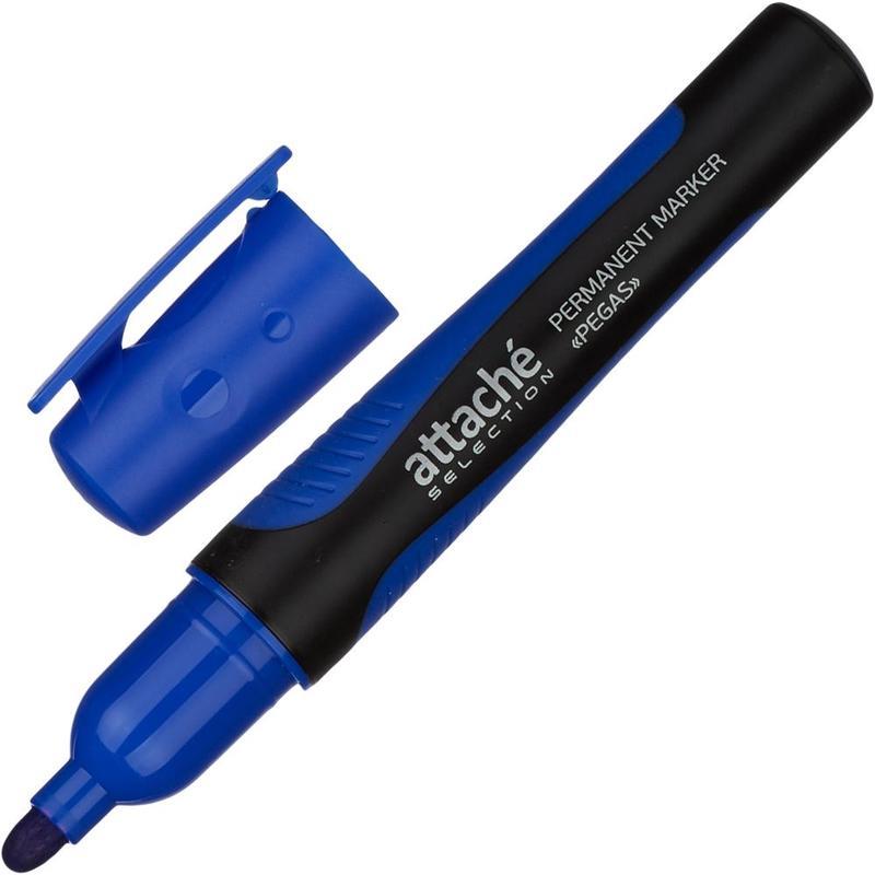Перманентный маркер Attache Selection Pegas в пластиковом черном корпусе с прорезиненными элементами. Круглый наконечник позволяет провести линию толщиной 2-5 мм. Нестираемые чернила пишут на любой поверхности. Цвет — синий.