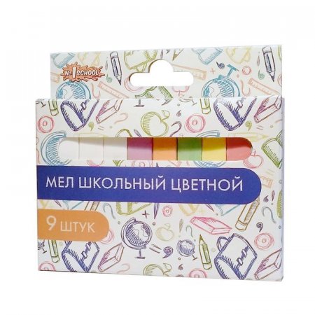 Мел школьный цветной средней мягкости, набор из 9 штук, в котором 6 цветных мелков и 3 белых. Изготовлен с использованием натуральных красителей. Мел не крошится и не царапает покрытие. Предназначен для рисования на любой шероховатой поверхности. Упаковка — коробочка с европодвесом, изготовленная из картона плотностью 280 гр/м2, полноцветная печать. Размер упаковки — 11.3x10.6x1.7 см.