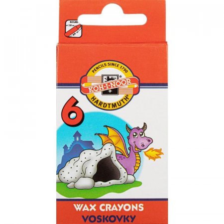 Мелки восковые Koh-I-Noor, 6 цветов. Упакованы в картонную коробку с европодвесом. Диаметр — 8 мм, длина — 85 мм.