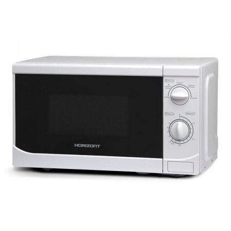 Микроволновая печь Horizont 20MW700-1378B привлекает внимание красивым контрастом черного стекла дверцы и белого цвета корпуса, а также наличием наиболее востребованных функций. В этой модели выбор нужных режимов подогрева осуществляется с помощью поворотных переключателей. Верхний переключатель устанавливает температурный режим, соответствующий одному из 5 доступных уровней мощности. Нижний — переключатель таймера — определяет время прогрева блюда в рабочей камере в диапазоне от 0 до 35 минут. О завершении работы оповещает звуковой сигнал.