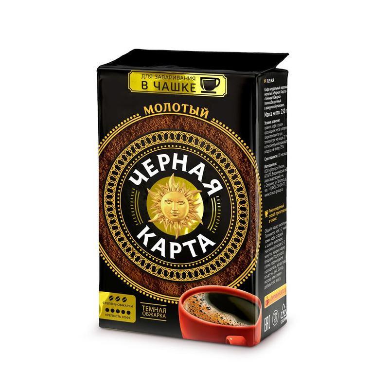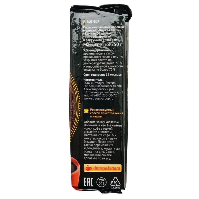 Кофе Черная Карта Темная обжарка молотый, 250 г — интенсивный настой, созданный для ценителей глубокого, яркого и крепкого кофе, способного быстро взбодрить и пробудить энергию на весь день. Замечательный бленд произведен из отборного кофе высшего сорта, а темная обжарка раскрывает самые потаенные нотки кофейного зерна. Приятная горчинка и бодрящий аромат подарят приятные впечатления и отличное настроение ценителям насыщенного напитка.
