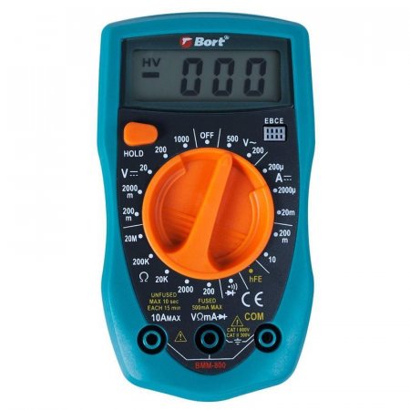 Мультитестер BORT BMM-800 — недорогой и удобный измерительный прибор. Понятие «мультиметр» более точно отражает назначение этого многофункционального прибора. Число имеющихся разновидностей настолько велико, что каждый инженер может найти прибор, в точности отвечающий его специфическим требованиям как по виду и диапазону измеряемых величин, так и по набору сервисных функций. Главное, чтобы выбранный прибор соответствовал предполагаемым условиям эксплуатации, а его корпус обеспечивал достаточную защиту. С помощью BMM-800 можно измерить как напряжение и силу постоянного тока, так и напряжение и силу переменного тока, а также сопротивление сети. Он подойдет для определения непрерывности сети и для проверки диодов. Прибор оснащен электронной защитой входов. Достоинствами данной модели является компактность и простота использования.