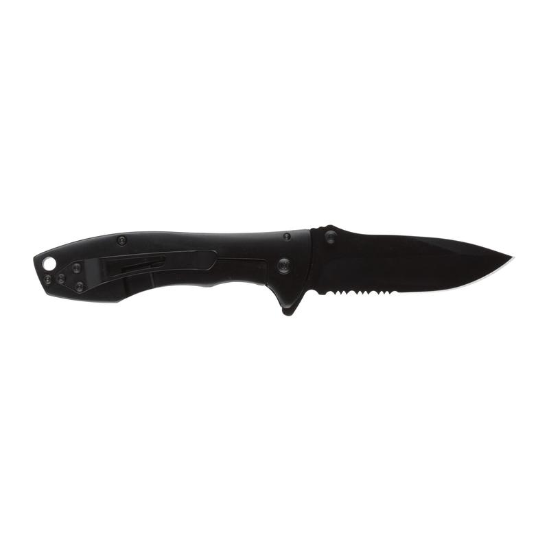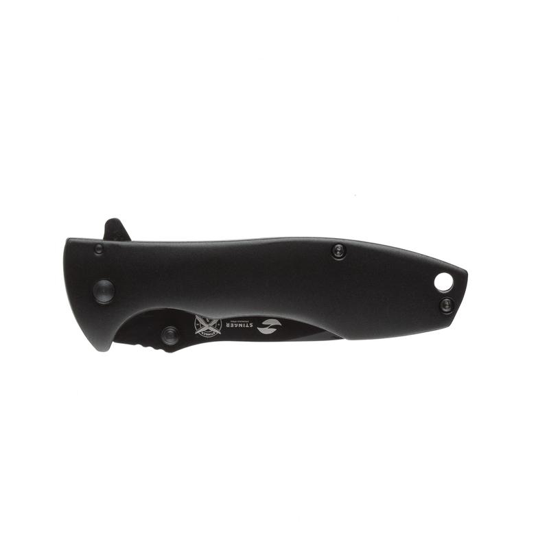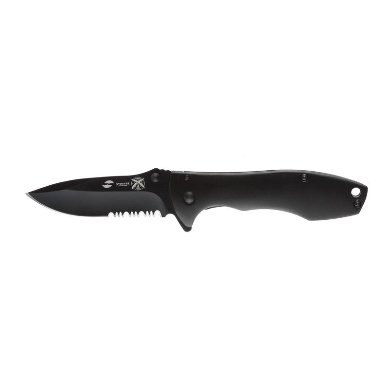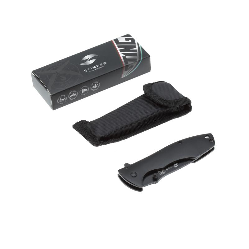 Нож складной Stinger. Материал лезвия: нержавеющая сталь марки 3Cr13, материал рукояти: сталь алюминий, фиксатор лезвия: Frame Lock, длина ножа: 185 мм, длина клинка: 80 мм, толщина клинка: 3 мм, вес: 103 г, цвет рукояти: матовый черный. Особенности: лезвие с серрейторной кромкой, рукоять с клипом и отверстием под темляк. Метод открывания клинка: шпенек (подпальцевый упор на лезвии). В комплекте: нейлоновый чехол.