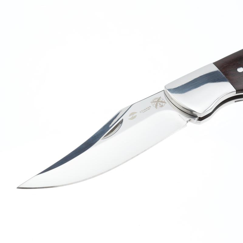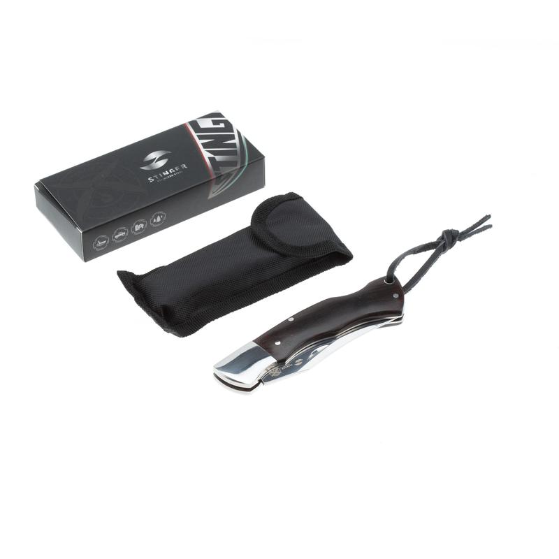 Нож складной Stinger. Материал лезвия: нержавеющая сталь марки 8Cr13, материал рукояти: сталь дерево орех, фиксатор лезвия: Back Lock, длина ножа: 220 мм, длина клинка: 92 мм, толщина клинка: 3 мм, вес: 161 г, цвет рукояти: серебристо-коричневый. Особенности: с темляком. Метод открывания клинка: за выемку на лезвии. В комплекте: нейлоновый чехол, кожаный шнурок.