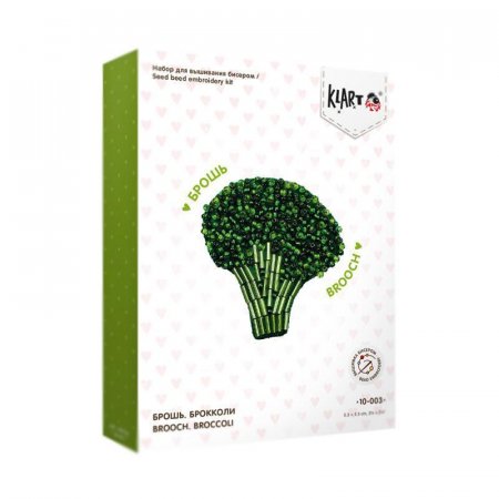 Набор для творчества Klart Брокколи изготовление броши. В набор для вышивания входит: картон, фетр, хлопчатобумажные нитки мулине «Gamma», бисер, тонкая игла для вышивания бисером Gamma, замок для броши, выкройка, подробная инструкция с иллюстрациями. Размер готовой работы: 5x7 см. Количество цветов: 3 цвета бисера. Тип упаковки: картонная упаковка с европодвесом.