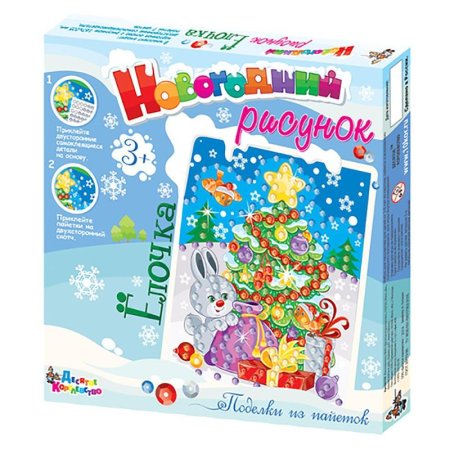 Набор для творчества, состоящий из рисунка-открытки, набора пайеток и блока двустороннего скотча для их крепления. Пайетки классические, с «дырочкой», но гвоздей в наборе нет, мы заменили их двусторонним скотчем, что позволяет давать игру детям более младшего возраста. Это же избавляет от необходимости класть в набор поле из пенопласта, что серьезно удешевляет игрушку. На рисунке обозначены места, на которые необходимо приклеить кружочек скотча и сверху прикрепить пайетку соответствующего цвета. Контроль со стороны взрослого необходим, несмотря на отсутствие гвоздиков, ведь в наборе много мелких (ярких и блестящих!) деталей.