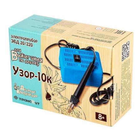Представляем Вашему вниманию прибор для выжигания по дереву «Узор-10к», с двухступенчатым режимом нагрева. Электроприбор «Узор-10к» (ЭВД-20/220) имеет небольшие габариты, помещен в прочный пластмассовый корпус, а два режима нагрева выжигателя вполне достаточно для начинающих любителей выжигания по дереву. Нагрев нихромовой иглы выжигателя, в отличие от переделанных из паяльника, происходит в течении 1 минуты, а остывание займет не более 3–5 минут (в зависимости от режима нагрева прибора). Это очень актуально, когда ребенок пользуется прибором вне дома, например, в школе на уроках труда или в кружках детского творчества и на порядок снижает возможность оказаться раскаленным в ранце ребенка или ящике стола. Прибор для выжигания по дереву «Узор-10к» полностью соответствует требованиям 14 МО.390.074ТУ, ТО 9632-001-59017562-2013 и предназначен для детей от 8 лет. Номинальное напряжение сети питания — 220 В. Потребляемая мощность — 20 Вт. Вес — 0,66 кг. Длина сетевого шнура 1,5 м. Длина шнура выжигательного карандаша 0,8 м.