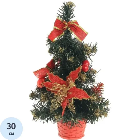 Елка новогодняя настольная конусного типа с украшениями из текстильных материалов красного цвета (бант, цветы, шары) не имеет ствола. Хвоя из ПВХ зеленого цвета с блестками накручена на металлическую спираль. Подставка — корзина из пластика. Высота 30 см. Упаковка — пакет.