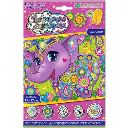 Картина-антистресс «Слоник». Волшебство техники «антистресс-декорирование стикерами» вовлекает в процесс творчества даже самых маленьких детей: ребенок старше 3 лет вместе с мамой наклеит узорные разноцветные стикеры и блестящие голографические элементы на изображение веселого «Слоника», и картинка заиграет яркими цветами и солнечными зайчиками — прямо как в сказке!
