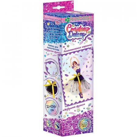Набор «Воздушное фуэтэ» серии «Романтические картины» предлагает подростку старше 10 лет создать оригинальную картину из стикеров на прозрачном пластике, декорируя изображение гармонично сочетающимся с рисунком невесомым фатином и атласной лентой. Нежный сюжет — легкое движение в танце юной балерины среди сверкающих звезд и парящих перьев — передает романтическую атмосферу радости и эффект невесомости. Изысканность сюжета сочетается с легкостью исполнения: по схеме наклеить на прозрачный пластик красочные детали-самоклейки и голографические стикеры, собрать на проволоку фатин и закрепить его на картине, завязать бант из ленты. Картина будет эффектно смотреться на фоне узора обоев. А в рамке из багета картина превратится в настоящий шедевр и станет ярким акцентом в любом интерьере!