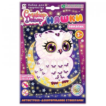 Детям от 3-х лет будет несложно создать картину с белым совёнком-Поляриком: нужно наклеить стикеры-пёрышки и стикеры-пятнышки на изображение персонажа на фоне, наклеить голографические круги на изображение луны на фоне, заполнить пространство вокруг Полярика и луны фигурными голографическимистикерами-звёздами, — и замечательная картина с ярким персонажем на фоне звёздного неба готова!