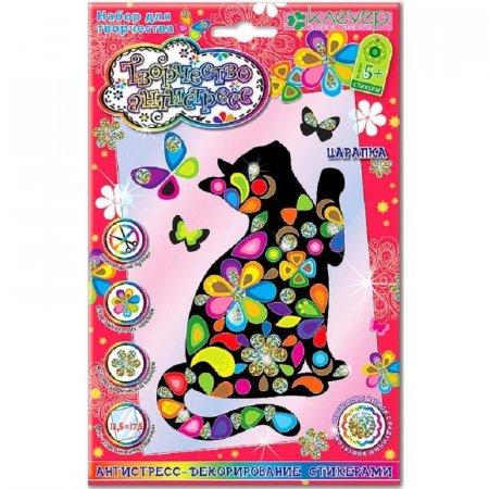 Набор для творчества Клевер изготовление картины Царапка. Картины-антистресс — это лучший способ отдохнуть и зарядиться энергией творчества! Ребёнок старше 5 лет легко наклеит на матированный полупрозрачный пластик изящные чёрные силуэты кота Царапки и порхающих вокруг бабочек, заполнит их узорными радужными стикерами, а потом украсит картину блестящими голографическими элементами разнообразных форм.