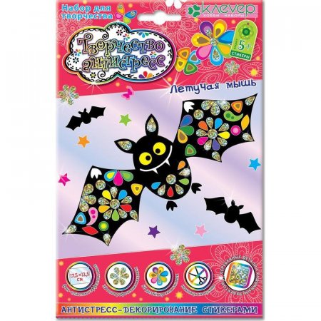 Набор для творчества Клевер Летучая мышь изготовление картины — это лучший способ отдохнуть и зарядиться энергией творчества! Ребёнок старше 5 лет легко наклеит на матированный полупрозрачный пластик силуэты большой забавной летучей мыши и двух маленьких летучих мышек, заполнит их узорными радужными стикерами, а потом украсит картину разноцветными стикерами-звёздами и блестящими голографическими элементами разнообразных форм.