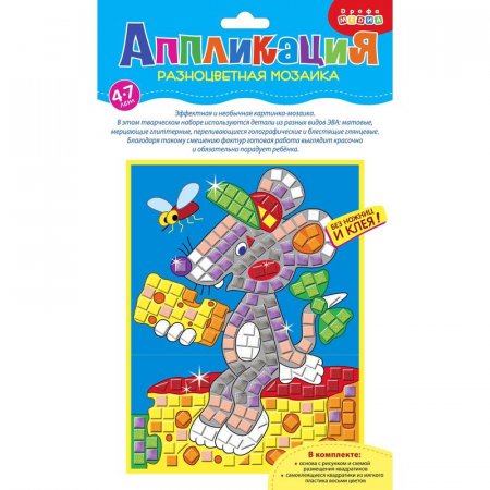 Небольшая, но яркая и блестящая мозаика особенно понравится юным мастерам. В творческом наборе используется несколько видов деталей — матовые без покрытия, блестящие глиттерные, переливающиеся голографические и гладкие мерцающие бумажные. Благодаря такому смешению фактур и материалов, готовое изделие выглядит ярко, красочно и весело.