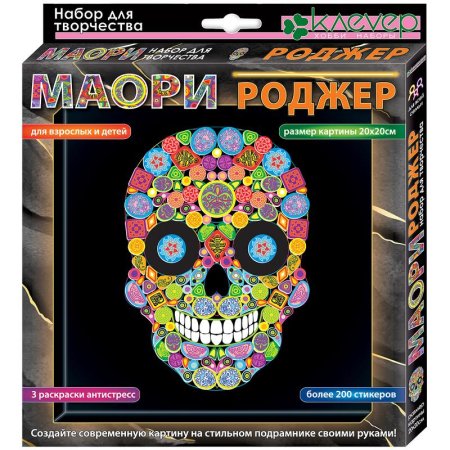 Набор «Роджер» серии «Маори» — настоящая свобода творчества в создании своей собственной картины с изображением веселой разукрашенной калаверы (исп. «calavera» — череп). Детям старше 10 лет и взрослым будет интересно и просто создать свою картину: наклеить яркие этнические стикеры по своему усмотрению в рамках контура при помощи разметки на черную картонную основу, которую затем нужно будет собрать с помощью двустороннего скотча в сверхмодный подрамник. Этническая яркая картина на черном подрамнике — хит творчества! Комплектация: стикеры из цветной самоклейки, цветной фон-подрамник из картона, листы-раскраски, инструкция на упаковке и внутри упаковки. Упаковка: картонная коробка с европодвесом. Размер упаковки: 205x225x17 мм.