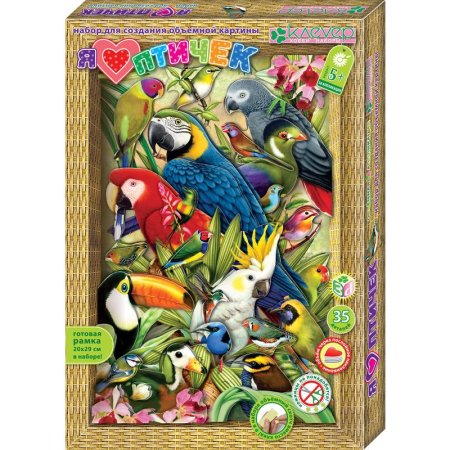 Красочную картину «Я люблю птичек» ребенок старше 5 лет с помощью взрослых сможет сделать сам — без клея и ножниц, в технике 3D аппликации. Большие красный и синий попугаи ара и другие веселые попугайчики, экзотические разноцветные птички выглядывают из цветущих джунглей, приглашая в свой пестрый и яркий мир! Работая с набором, ребенок учится складывать трехмерное изображение из частей, составляя перспективу. Рамку собирать не нужно — красочная и глубокая готовая рамка входит в набор. Клей также не нужен — вместо него в наборе объемный двусторонний скотч. Комплектация: готовые бумажные детали, собранная рамка из плотного картона, двусторонний объемный скотч. Упаковка: картонная коробка в термоусадочной пленке.
