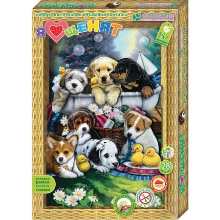 Красочная картина «Я люблю щенят» ребенок старше 5 лет с помощью взрослых сможет сделать сам — без клея и ножниц, в технике 3D аппликации. Персонажи картины — забавные щенята-шалуны, которые купаются на зеленой лужайке вместе с пушистыми утятами. Работая с набором, ребенок учится складывать трехмерное изображение из частей, составляя перспективу. Рамку собирать не нужно — красочная и глубокая готовая рамка входит в набор. Клей также не нужен — вместо него в наборе объемный двусторонний скотч. Комплектация: готовые бумажные детали, собранная рамка из плотного картона, двусторонний объемный скотч. Упаковка: картонная коробка в термоусадочной пленке. Размер упаковки: 200x290x30 мм.