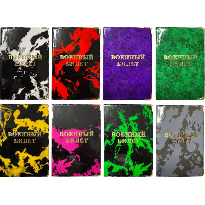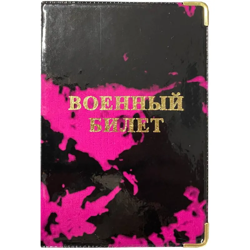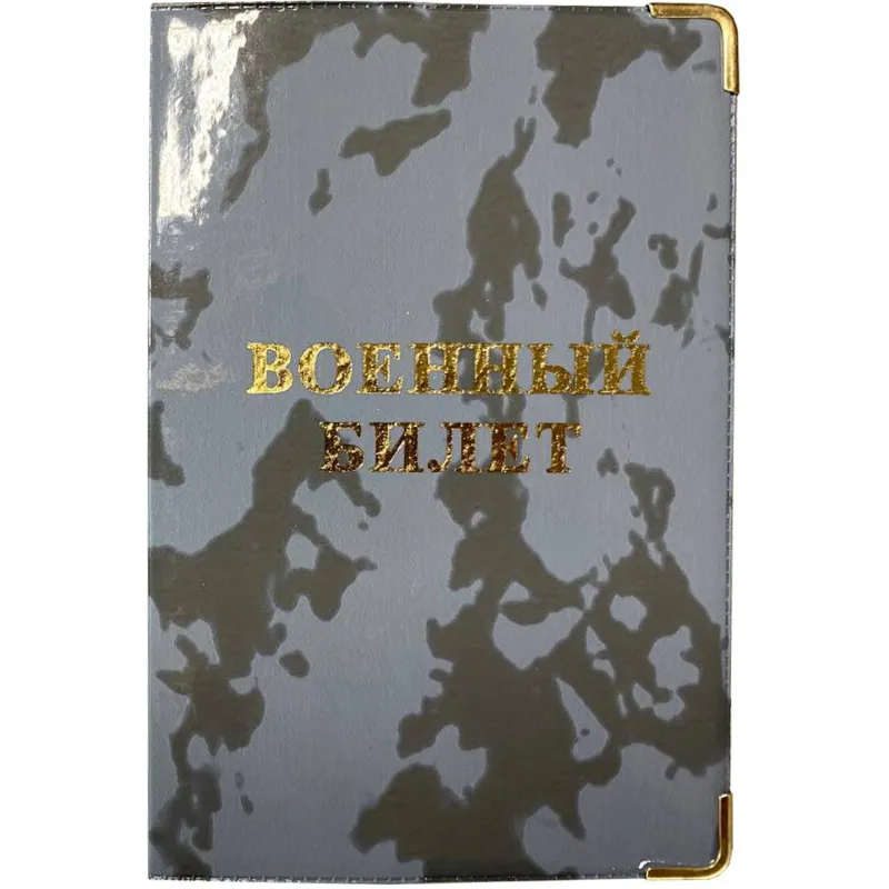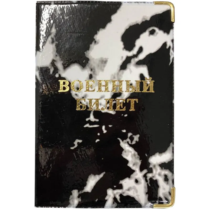 Обложка для военного билета выполнена из ПВХ, с металлическими уголками, с картоном внутри. На лицевой стороне методом тиснения золотой фольгой нанесена надпись «военный билет».