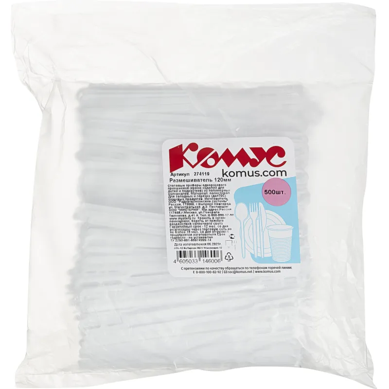 Размешиватель одноразовый Комус Эконом белый 120 мм 500 штук в упаковке
