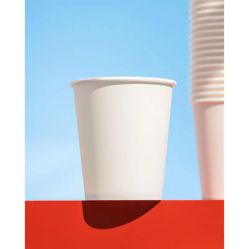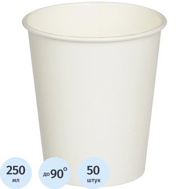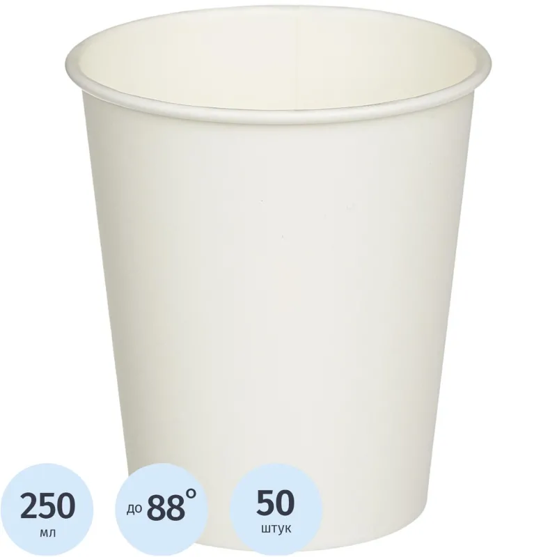 Одноразовый бумажный стакан изготовлен из однослойного картона высокой плотности. Предназначен как для холодных, так и для горячих напитков. Рабочий объем каждого стакана — 250 мл, полный объем — 280 мл. Максимальная допустимая температура жидкости — 83 градус.C. В одной упаковке — 50 штук.