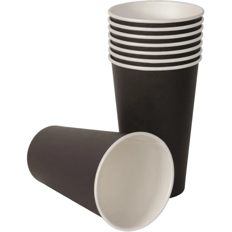 Стаканы одноразовые бумажные подходят как для холодных, так и для горячих жидкостей, поскольку изготовлены из плотного бумажного материала с ламинацией на внутренней стороне. Цвет черный. Рабочий объем стакана — 400 (+/- 10) мл, полный объем — 530 (+/- 10) мл. В одной упаковке 50 штук. Максимальная допустимая температура жидкости — 100градус.C. Плотность бумаги — (260 15PE) -10%.