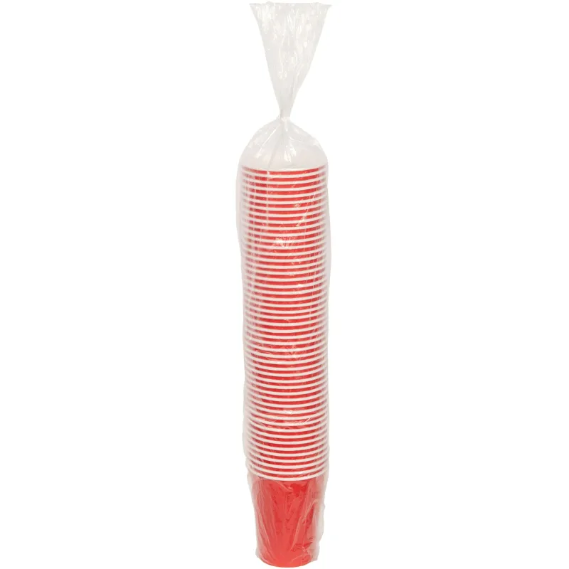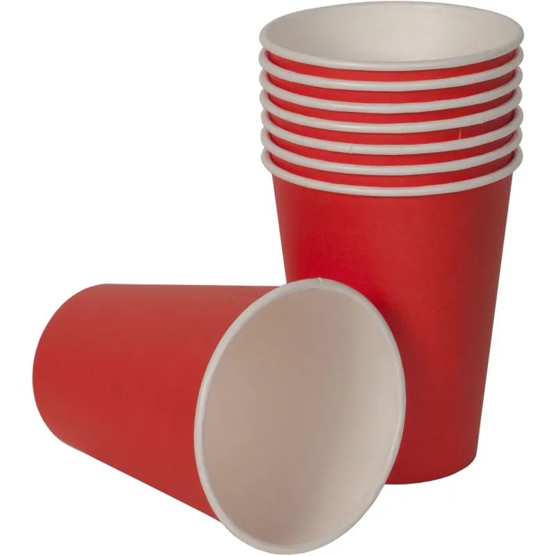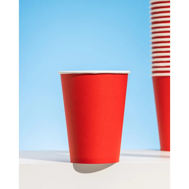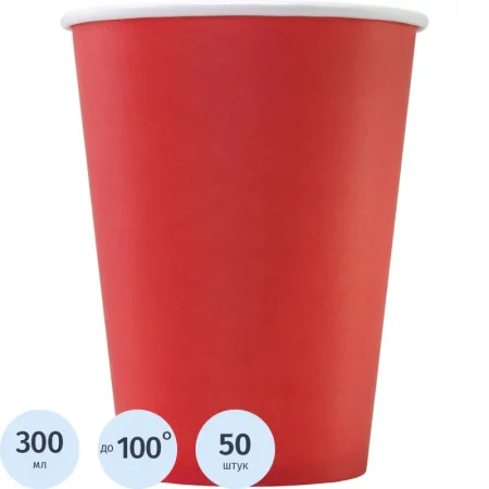 Стаканы одноразовые бумажные подходят как для холодных, так и для горячих жидкостей, поскольку изготовлены из плотного бумажного материала с ламинацией на внутренней стороне. Цвет красный. Рабочий объем стакана — 300 (+/- 10) мл, полный объем — 430 (+/- 10) мл. В одной упаковке 50 штук. Максимальная допустимая температура жидкости — 100градус.C. Плотность бумаги — (260 15PE) -10%.