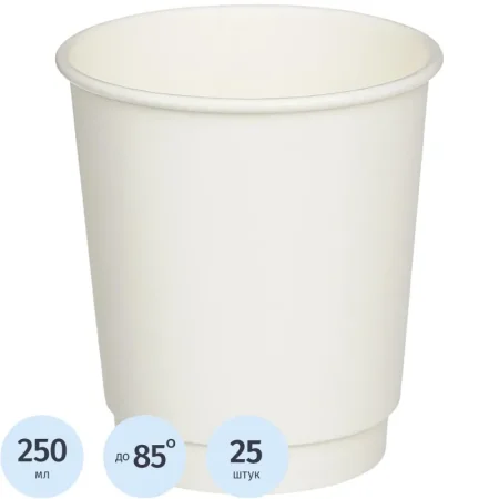 Одноразовые стаканы изготовлены из двухслойного картона высокой плотности. Предназначены как для холодных, так и для горячих напитков. Рабочий объем каждого стакана — 250 мл, полный объем — 280 мл. В одной упаковке 25 штук. Плотность внутреннего слоя — (232 15PE) -10%; наружного слоя — 200 -10%.