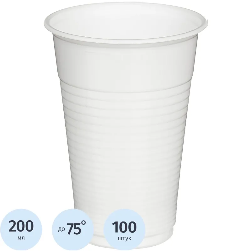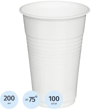Стаканы одноразовые предназначены как для холодных, так и для горячих напитков. Имеют рифленые стенки, изготовлены из прозрачного полипропилена белого цвета. Объем — 200 мл. Максимальная температура жидкости — 75 градусов по Цельсию. Одноразовые стаканы поставляются в упаковках по 100 штук, по 24 упаковки в транспортном коробе.