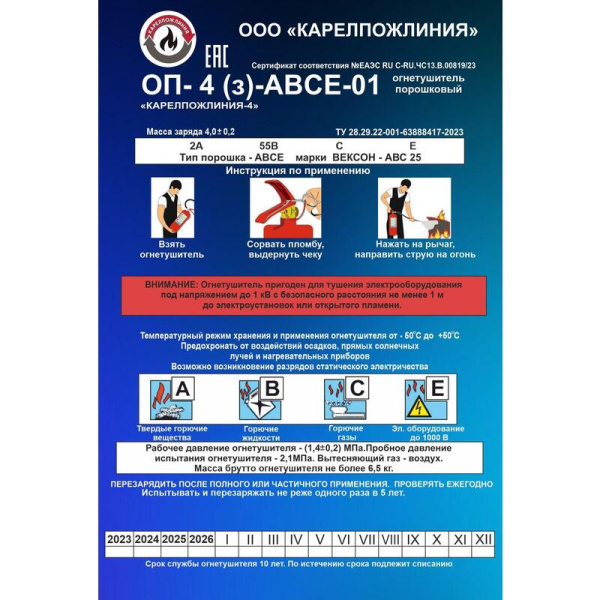 Огнетушитель порошковый КАРЕЛПОЖЛИНИЯ ОП-4(з) (АВСЕ, 2А 55В СЕ, ЗПУ-латунь)