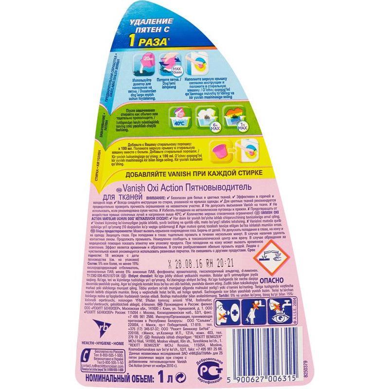 Пятновыводитель жидкий Vanish применяется как для цветного, так и для белого белья. Не содержит хлор. Содержит кислородосодержащий отбеливатель, благодаря которому безопасно и эффективно удаляет пятна. Пятновыводитель эффективен при низких температурах.