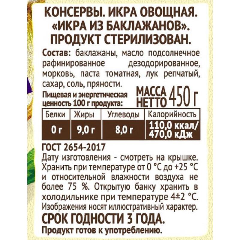 Икра баклажановая Пиканта — нежная, сочная и ароматная икра отличается прекрасным вкусом запеченных баклажанов. Эта 'заморская' икра очень популярна в нашей стране. Отличная готовая закуска, которую любят и взрослые, и дети. Овощная икра очень питательна и содержит необходимые человеку белки, жиры и углеводы. Овощная икра может использоваться как закуска, так и прекрасно подходит ко вторым блюдам.Состав: баклажаны, масло подсолнечное рафинированное дезодорированное, морковь, томатная паста, лук репчатый, сахар, соль, перец черный молотый, перец душистый молотый.Масса нетто: 450 г.Пищевая ценность: белки — 0 г, жиры — 9 г, углеводы — 8 г.Энергетическая ценность: 110 ккал.Хранить при температуре от 0 до 25°C и относительной влажности воздуха не более 75%. Не подвергать воздействию прямого солнечного света. Открытую банку хранить в холодильнике.Срок годности: 36 месяцевСтрана производства: Россия.
