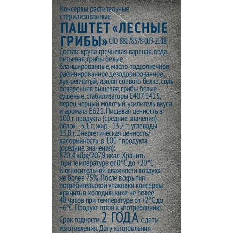 Состав: крупа гречневая вареная, вода питьевая, грибы белые бланшированные, масло подсолнечное рафинированное дезодорированное, лук репчатый, изолят соевого белка, соль, грибы белые сушеные, стабилизаторы Е407,Е415, перец черный молотый, усилитель вкуса и аромата Е621.