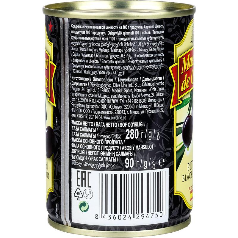 Маслины Maestro de Oliva черные без косточки, 280 г.Состав: вода, маслины, соль, регулятор кислотности: молочная кислота, фиксатор окраски: глюконат железа.Энергетическая ценность: 133 кКал/546 кДж.Условия хранения: хранить при температуре от +5°С до +25°С и относительной влажности воздуха не более 75%.