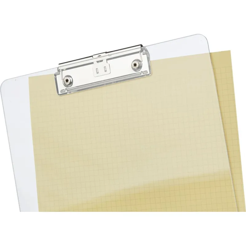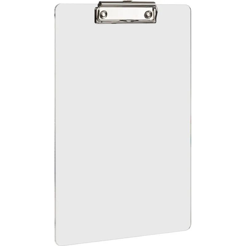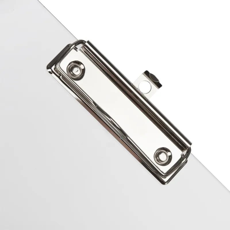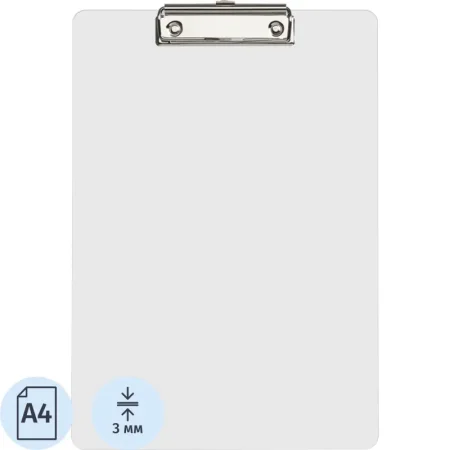 Планшет Комус формата А4 (220×320 мм) изготовлен из акрила толщиной 3 мм, углы скругленные. На одной стороне шириной 220 мм находится хромированный прижимной механизм для крепления листов. Механизм крепится к акриловой основе при помощи хромированных заклепок.