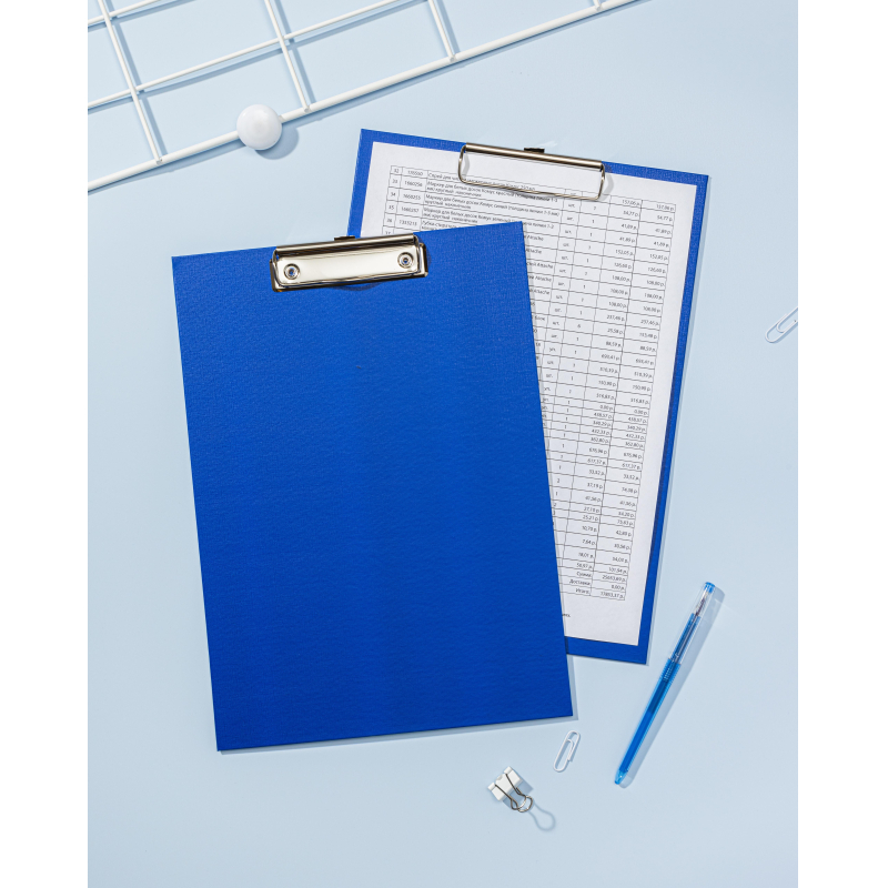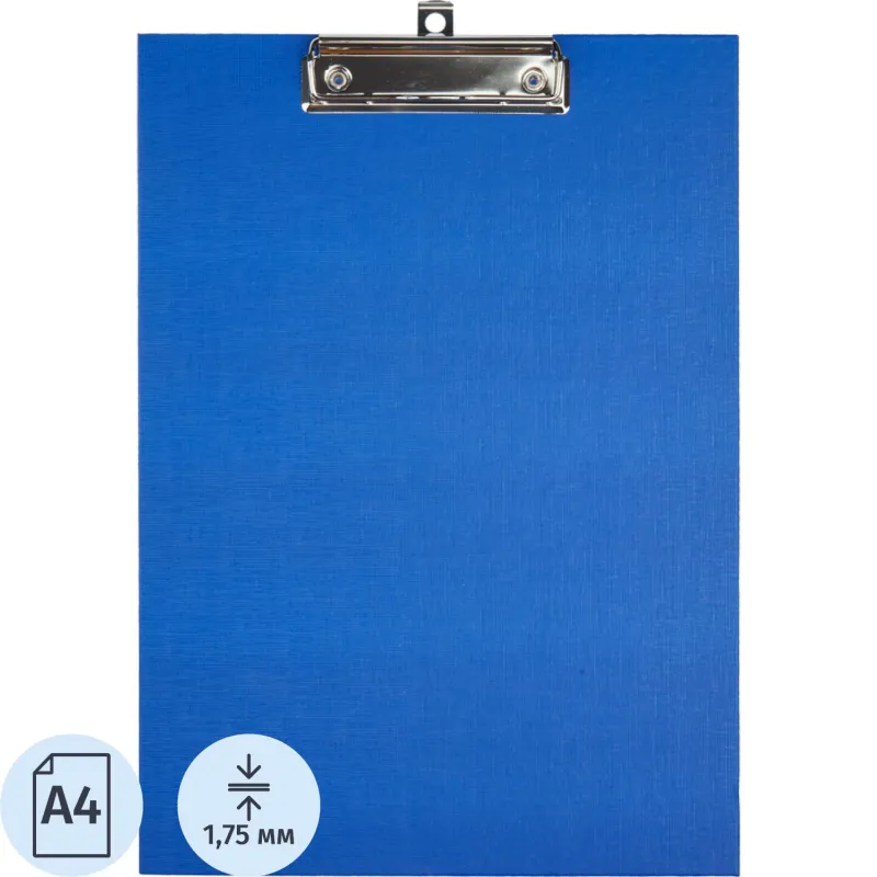 Планшет для бумаг Комус формата А4 изготовлен из плотного картона, покрытого пластиком (бумвинилом) синего цвета. Позволяет комфортно работать с документами на весу. Металлический прижим надежно удерживает листы и файлы.