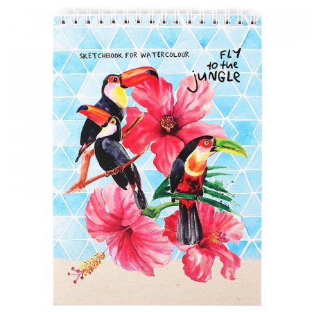 Скетчбук для акварели «Туканы в цветах» прекрасно подойдет для юных художников и любителей акварельной живописи. Формат — А5. Содержит 20 листов плотностью 200 г/кв.м. Жесткая подложка. Тип крепления — спираль.