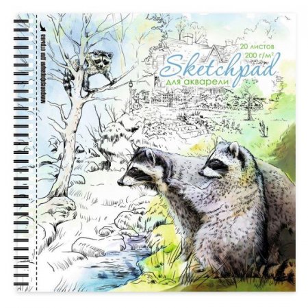 Скетчпад Феникс+ Еноты. Размеры: 195x195 мм. Содержит 20 листов, внутренний блок — белая акварельная бумага плотностью 200 г/кв.м. Твердый переплет, обложка — мелованный картон плотностью 190 г/кв.м, полноцветная печать с матовой ламинацией. Подложка — переплетный картон. Крепление — спираль.