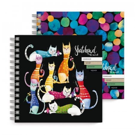 Скетчпад Феникс+ Коты и цветные круги. Размеры: 195x195 мм. Содержит 45 листов, 4 вида бумаги. Внутренний блок — белая каменная бумага, черная, серая, зеленая (плотностью 120 г/кв.м, 245 г/кв.м, 80 г/кв.м). Обложка полноцветная печать, твердый переплет на спирали, матовая ламинация, печать по фольге, УФ-лак выборочный.
