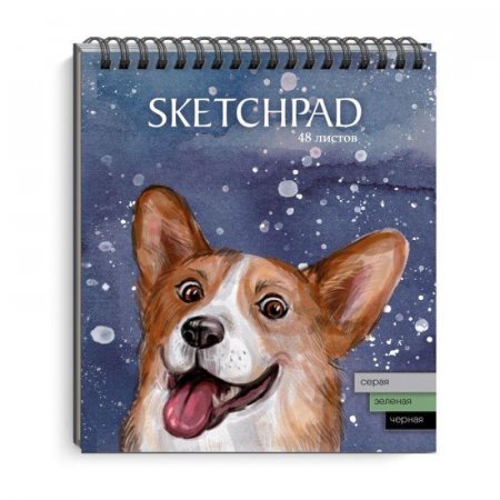 Скетчпад Феникс+ Собака формата А5. Размеры: 168x195 мм. Содержит 48 листов, внутренний блок — 16 листов черная, 16 листов серая, 16 листов зеленая бумага плотностью 120 г/кв.м. Обложка полноцветная печать, спираль по короткой стороне, выборочный ТВИН УФ-лак.