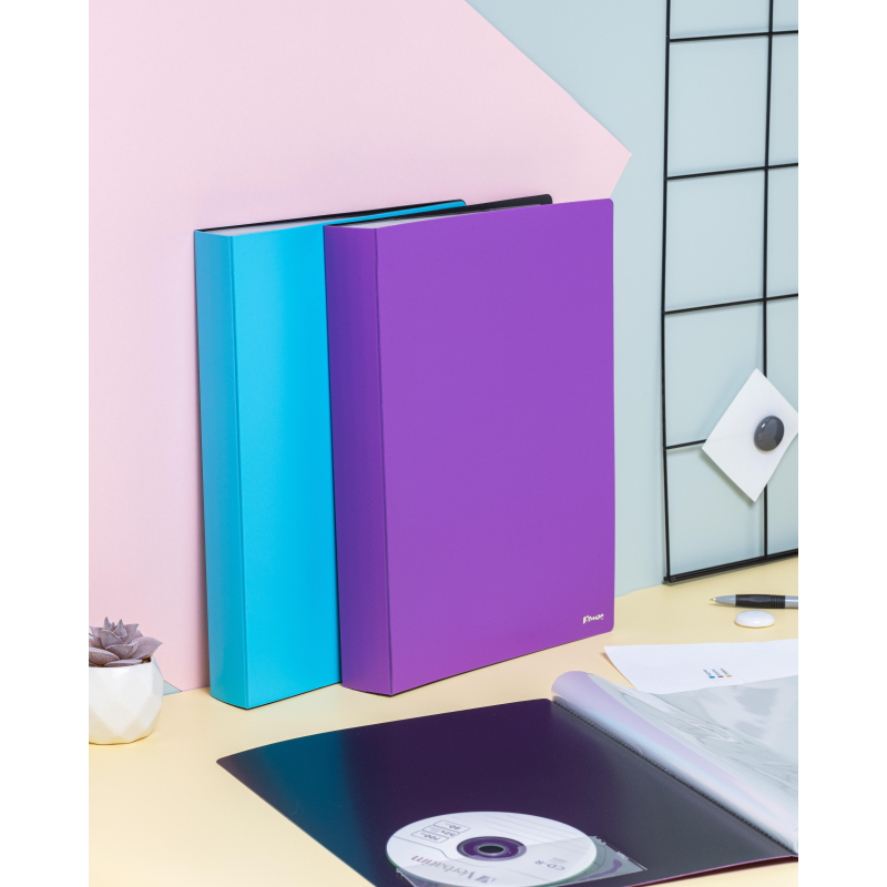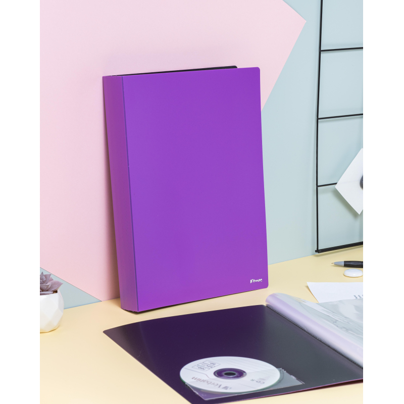 Папка с файлами Комус формата А4 изготовлена из полипропилена толщиной 0,8 мм двух цветов: сиреневого (внешняя поверхность) и черного (внутренняя поверхность). Имеет 60 несъемных прозрачных вкладышей для удобного хранения и демонстрации документов. В каждом из них можно разместить по два листа. Ширина корешка составляет 25 мм. Файловая папка дополнительно оснащена внутренним карманом для компакт-дисков и визитных карточек. Плотность файлов 30 мкм.