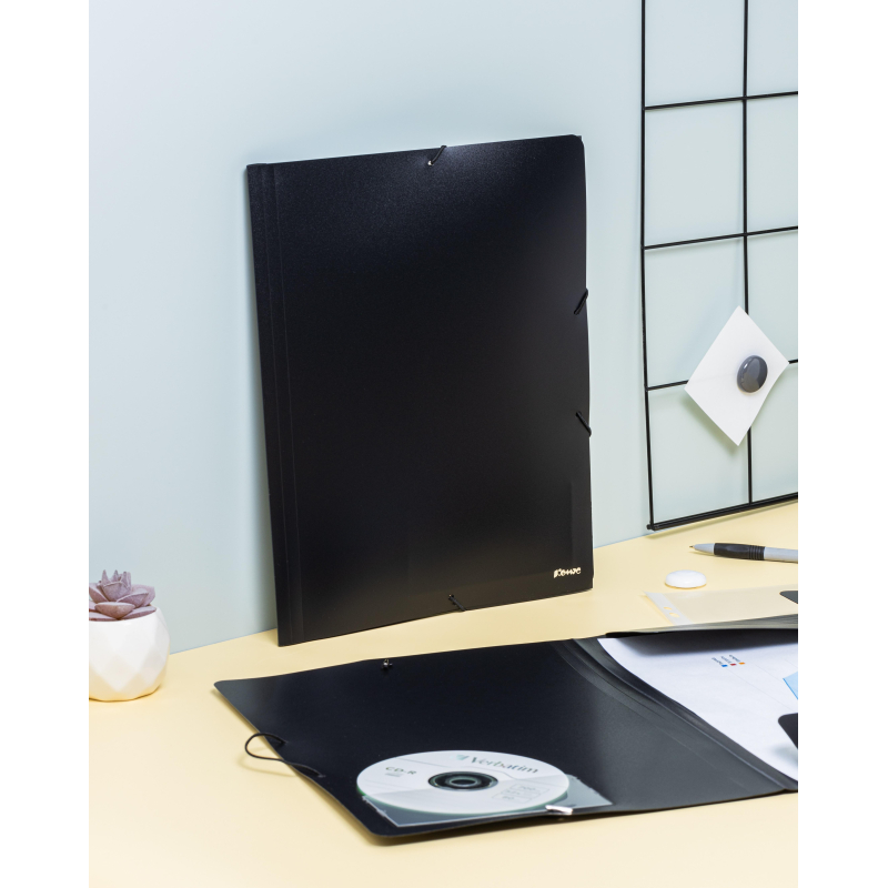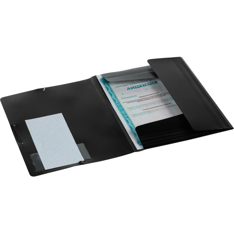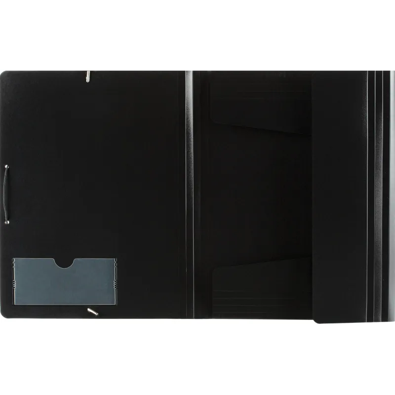 Папка на двух резинках «Комус» формата А4 выполнена из прочного полипропилена, толщиной 0,45 мм, черного цвета. Резинки надежно удерживают папку в закрытом состоянии. Вмещает до 300 листов стандартной плотности. Внутри есть карман для компакт-дисков и визитных карточек.